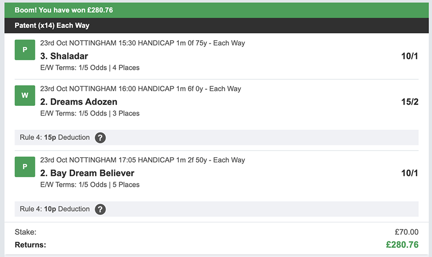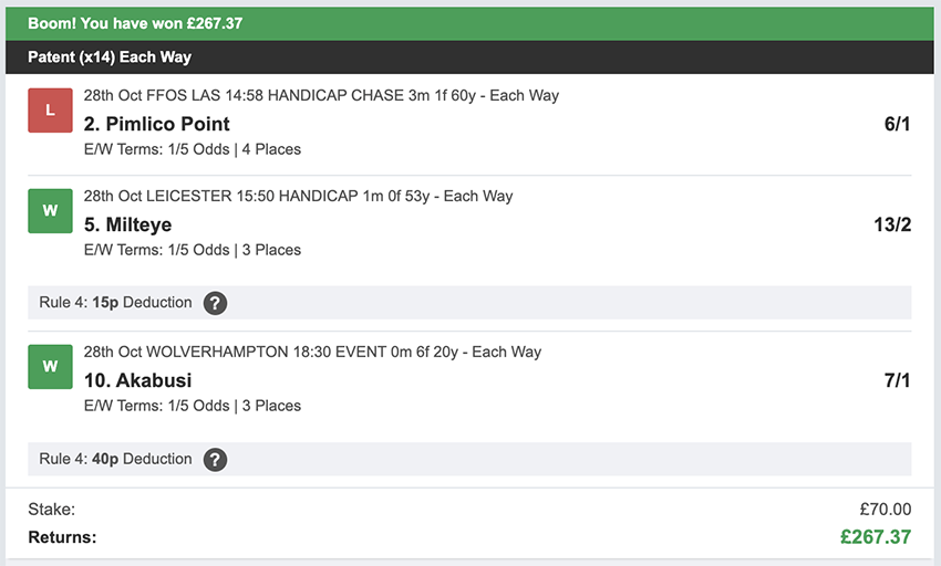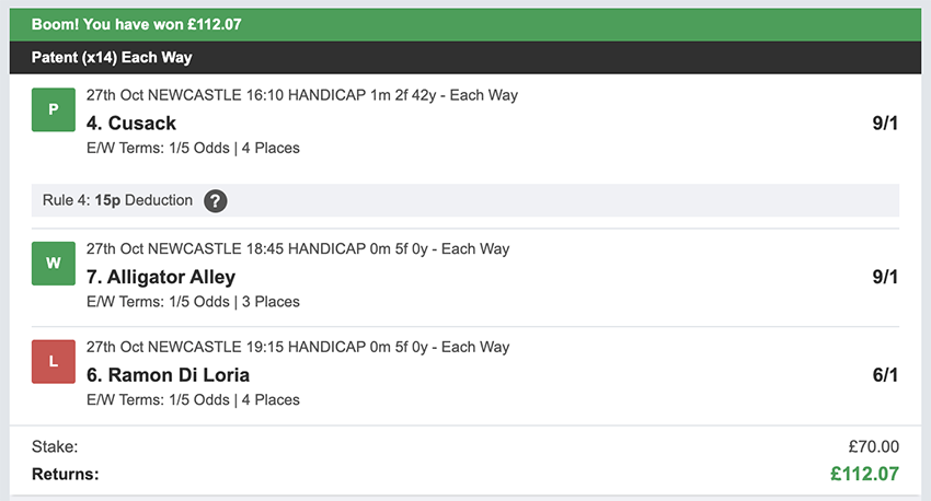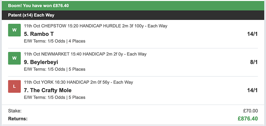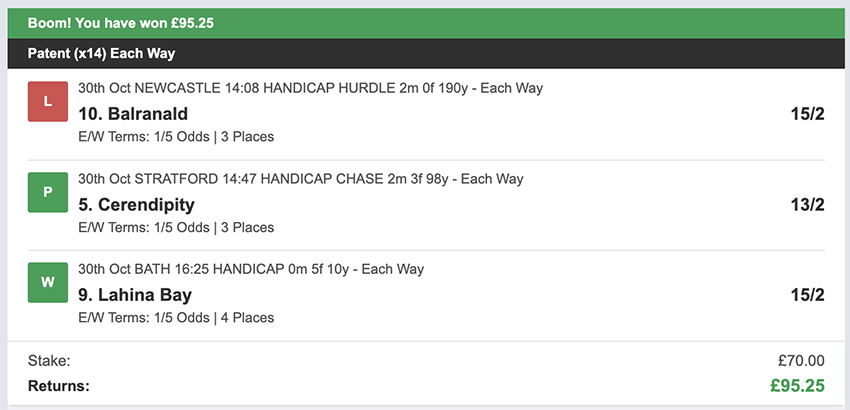 October wasn't a great month, we made less than the average profit and we didn't have a perfect 3/3 wins on any day this month, we came close a few times with 2 wins and a place on multiple occasions, that said I'm not going to turn my nose up at £840 profit. There were 27 betting days in October, taking out Sunday's. We made a profit on 9 of these, so more days ended in a loss than a profit, and there were 6 days where we didn't see a return of any kind. Taking out non-runners there were 79 selections: 15 winners (18.9% strike rate) 44.3% of selections saw a win or place.