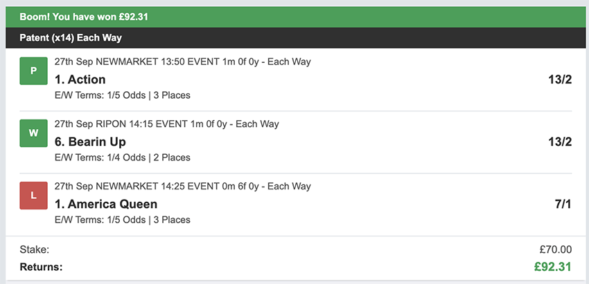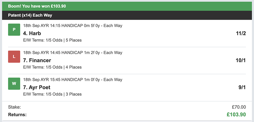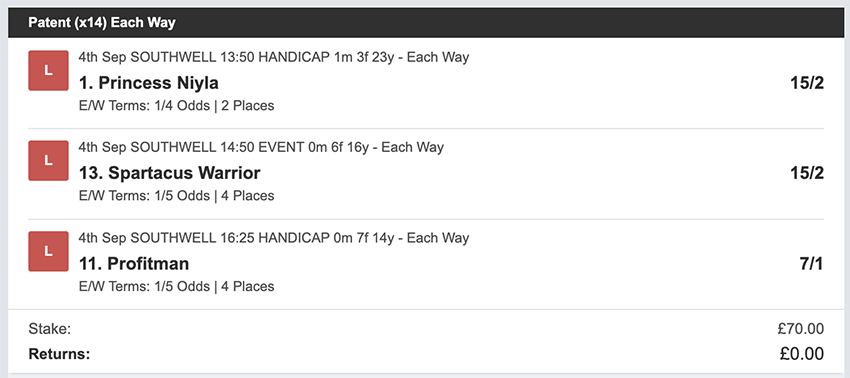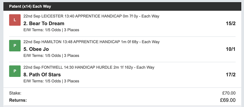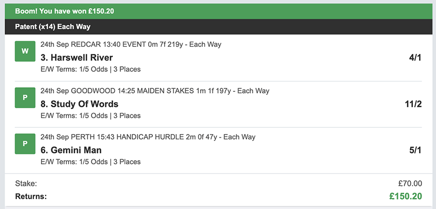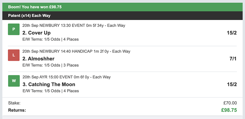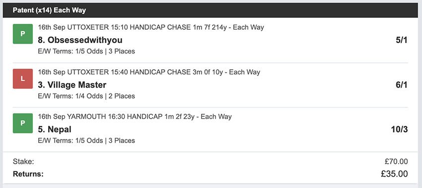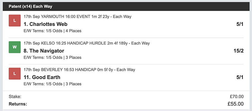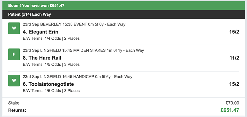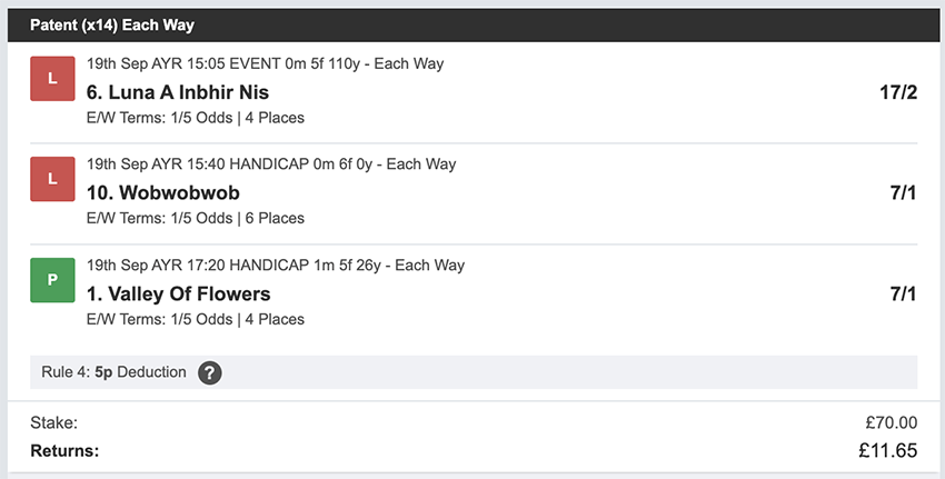 Profit/Loss +£28.75 21st September No Bets on Sundays 22nd September