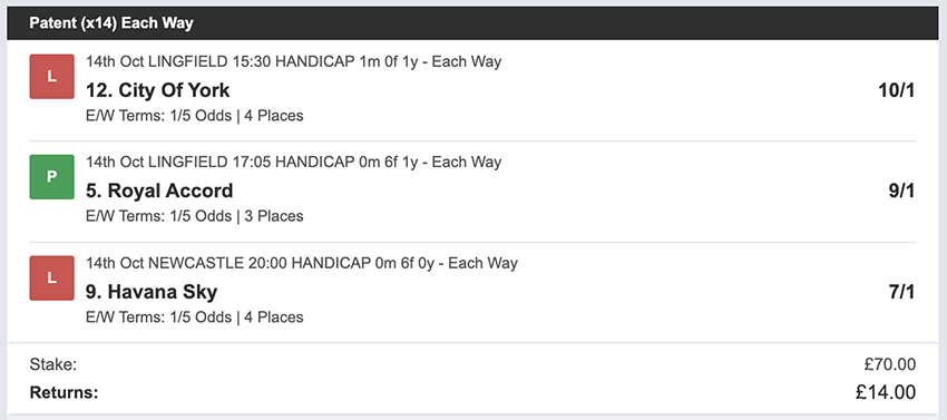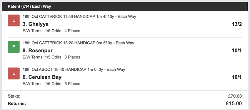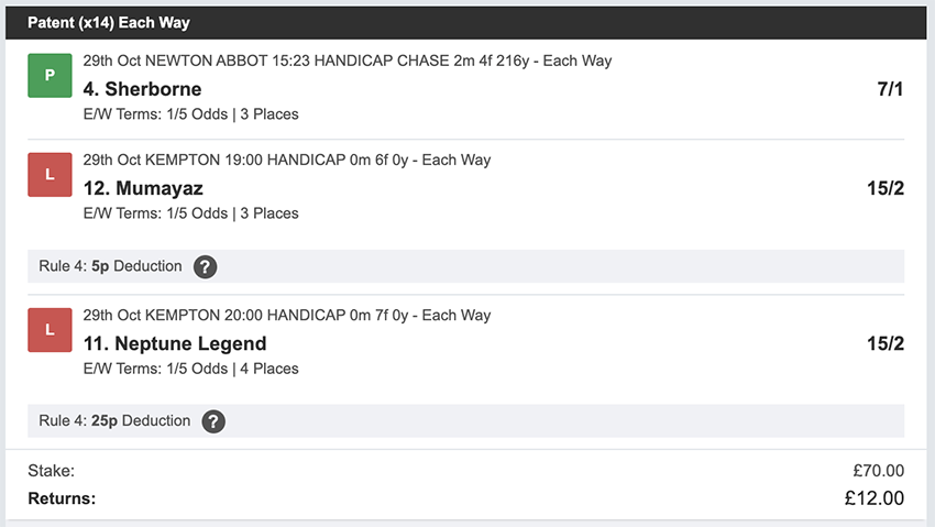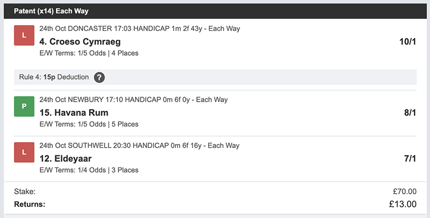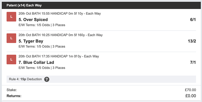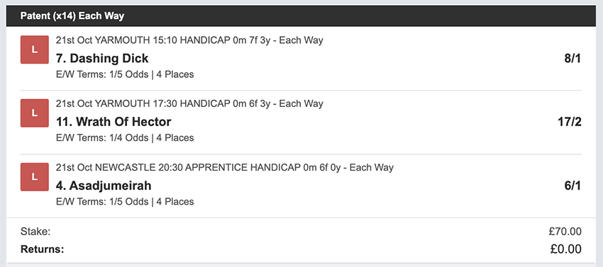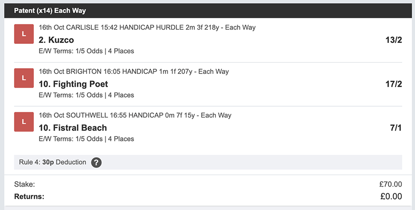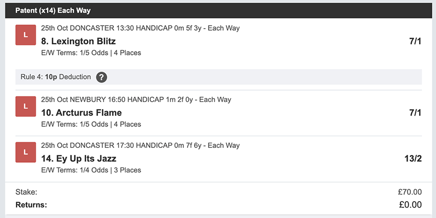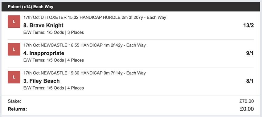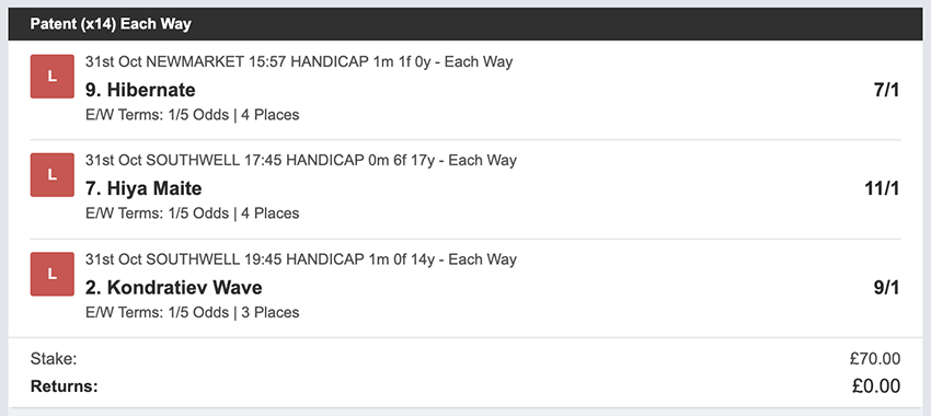 Profit/Loss -£70.00 26th October No Bets on Sundays 27th October