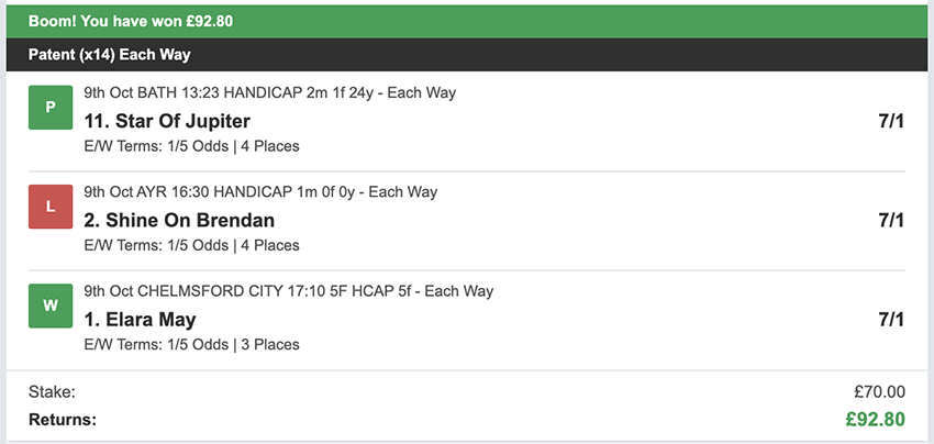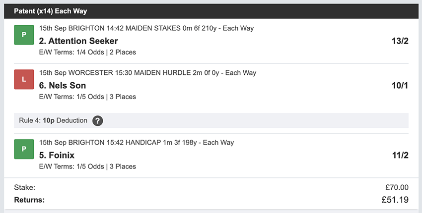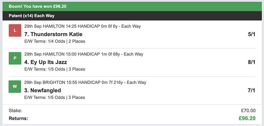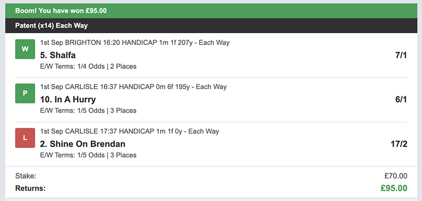 There were 25 betting days in September, taking out Sunday's and the strike day. We made a profit on 10 of these, so more days ended in a loss than a profit, but only 2 of these days saw the full stake lost, every other day saw at least a partial return. Taking out non-runners there were 73 selections: 16 winners (21.9% strike rate) 58.9% of selections saw a win or place. Here's how October's going... 1st October